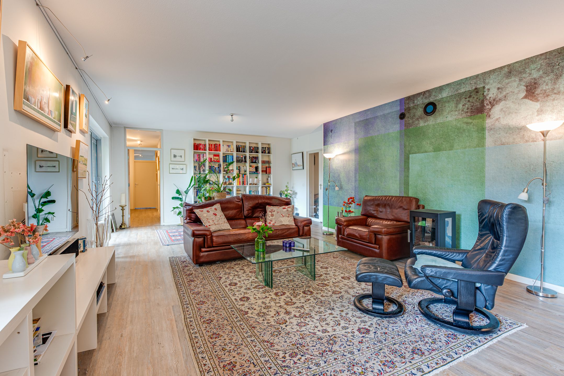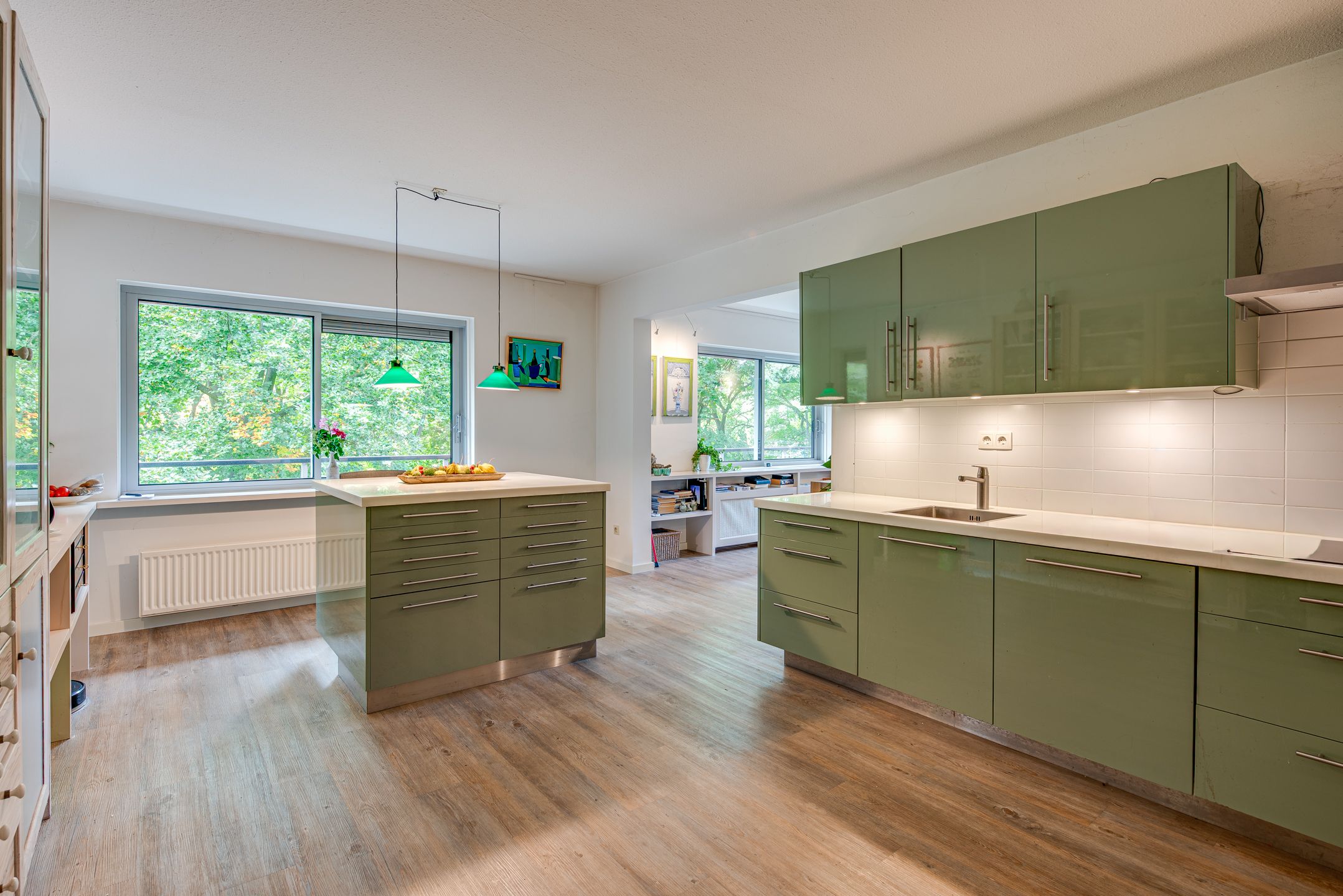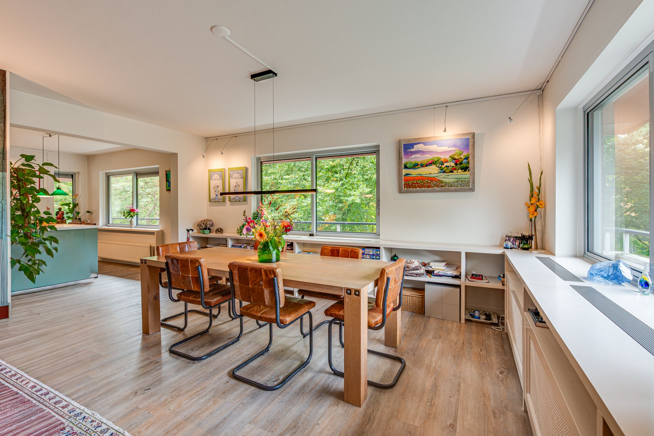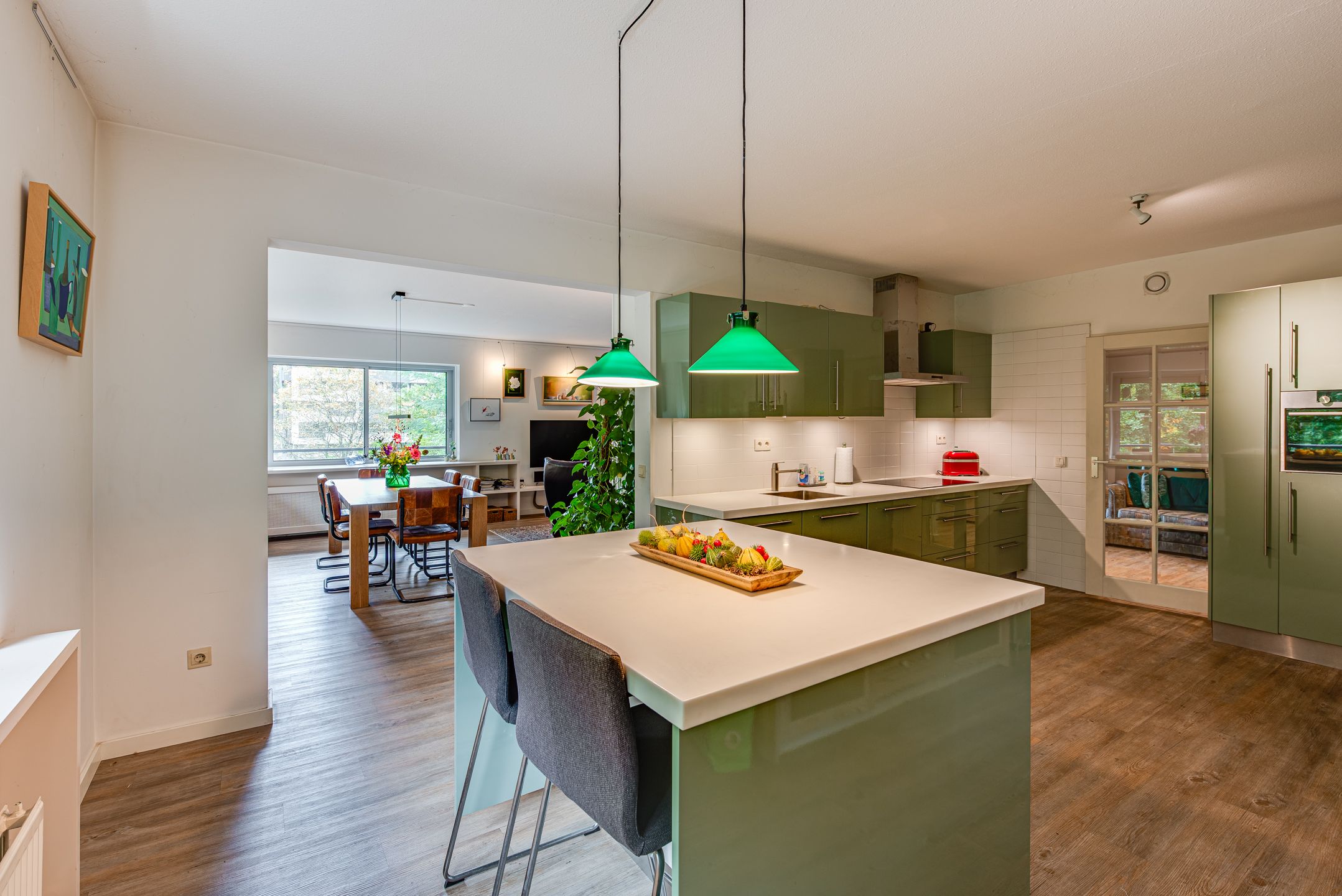 Aan de rand van villawijk Boomberg en tegenover het Corversbos gelegen riant 4 kamer appartement op de vierde woonlaag. Het gebouw is voorzien van een lift en heeft voor ieder appartement een eigen garageberging. Parkeren voor gasten is mogelijk op het ruim 5.000 m2 grote parkachtige terrein waarop de 2 appartementengebouwen zijn gebouwd. Het complex Corverserf is centraal gelegen in Hilversum, de bossen om de hoek, het Centrum en de uitvalswegen op korte afstand en de dagelijkse boodschappen doen veel bewoners in Kortenhoef, nog geen 5 minuten met de auto. Entree op de begane grond met video toegang en deuren naar de centrale hal met lift. Indeling: royale entree tevens garderobeberging, ruime hal met toilet, vaste kast en meterkast, toegang tot de grote en lichte living met rondom ramen, vloeiende overgang naar het eet gedeelte en de aansluitende luxe handgemaakte woonkeuken uit 2016 met alle inbouwapparatuur en Corian aanrechtbladen. De living heeft een schuifpui naar een mooi terras en een omloop rond woongedeelte van het appartement. De slaapvleugel bestaat uit een aparte gang waarop alle kamers uitkomen t.w., de master bedroom annex badkamer met inloopdouche en wastafelmeubel, de 2e en 3e slaapkamer en een wasbergkamer met aansluiting wasmachine. De servicekosten bedragen 543,80 per maand, het voorschot voor verwarming en water gebruik is nader vast te stellen.